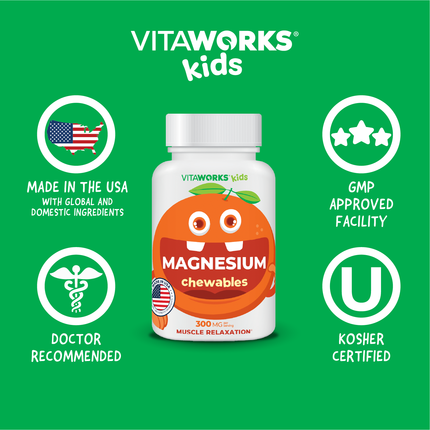 Help your child relax and recharge with VitaWorks Magnesium Chewables. Each serving provides 300mg of magnesium oxide, which may support stress relief, muscle relaxation, joint comfort, constipation relief, and healthy sleep. Relaxed muscles and a calm mind can help kids feel more at ease and ready for rest. These tasty orange-flavored chewables are vegan, vegetarian, non-GMO, kosher, and halal, and free from gluten, soy, dairy, eggs, peanuts, tree nuts, sesame, fish, and shellfish. A delicious alternative to pills or powders, they make it easy for kids and adults to enjoy the wellness benefits of magnesium every day.